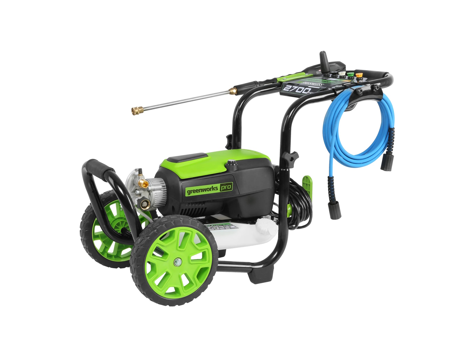 The Pro 2700 PSI Electric Pressure Washer delivers Better Than Gas™ performance with clean sustainable power. Featuring our patented JETTFlow™ Technology, the smart-sensing brushless motor automatically recognizes the selected nozzle and adjusts the water flow to whatever job you're trying to tackle. Does a typical power washer hose annoy you with frequent kinks, slowing down your job? Not anymore. This unit comes standard with a hassle-free 25-foot kink-resistant hose, which eliminates that unwanted frustration for good. Five nozzles (15°, 25°, 40°, soap, and turbo) are included to complete jobs of all types and applications. Reaching heights of over 20 feet, the Greenworks Pro 2700 PSI Pressure Washer easily helps you tackle hard-to-reach areas like roofs, eaves and gutters. Additionally, our Greenworks electric power washers are certified by the Pressure Washer Manufacturers' Association (PWMA) and come with an industry-best 10-year motor warranty combined with a 3-year tool warranty.